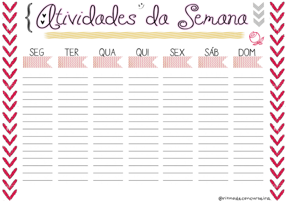 O rodapé do arquivo traz o identificador @ritmodeconcurseira, situando este material dentro de um cenário muito comum no Brasil contemporâneo: a preparação intensa para concursos públicos. Ferramentas como este planner de atividades semanais são cruciais para este público, que lida com editais extensos e a necessidade de equilibrar vida pessoal com horas líquidas de estudo.