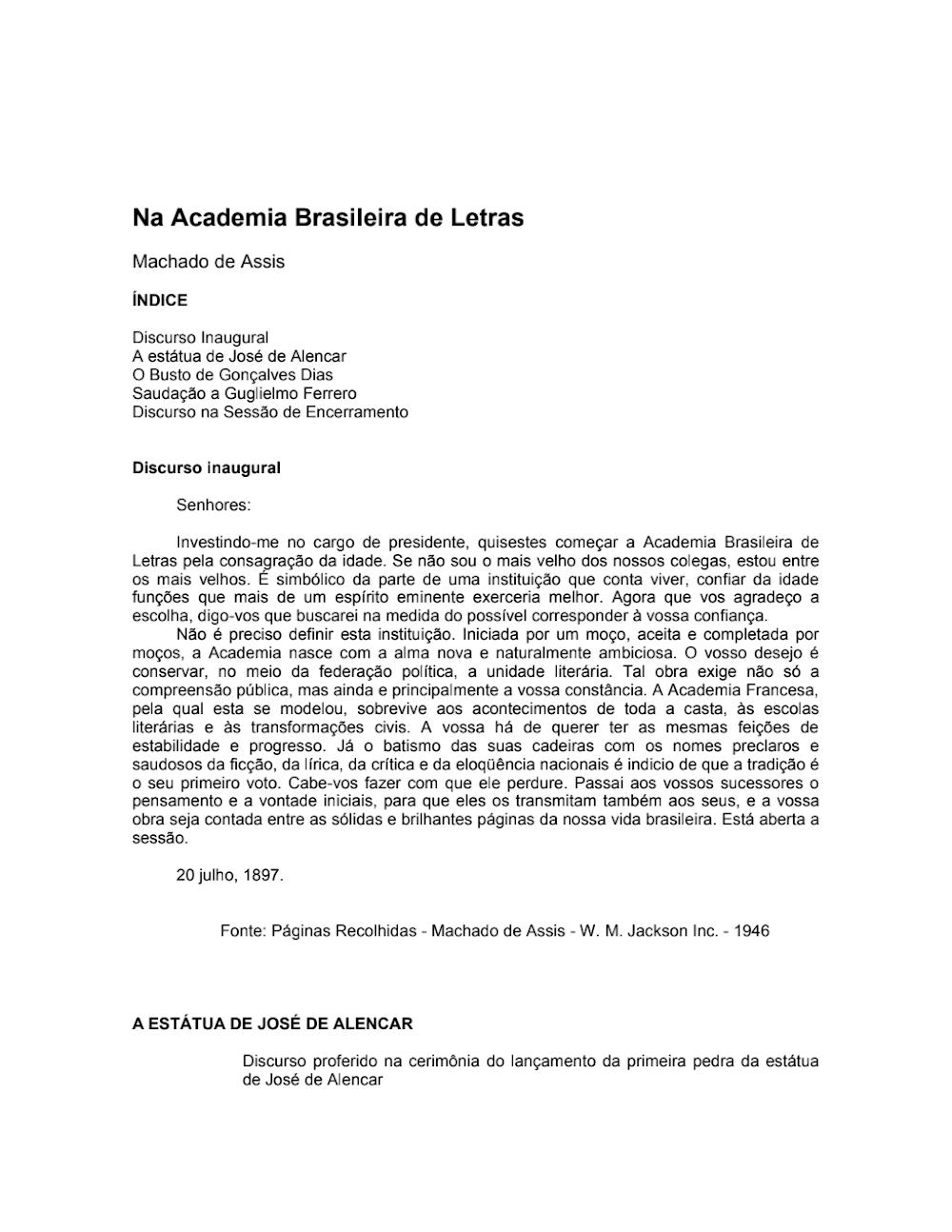 Este documento histórico oferece um olhar profundo sobre um dos momentos mais significativos da literatura brasileira: o Discurso Inaugural Machado de Assis ABL, proferido em 20 de julho de 1897. Como primeiro presidente da Academia Brasileira de Letras, Machado de Assis delineou a visão e os propósitos de uma instituição que se tornaria pilar da cultura nacional. O material é um valioso recorte da obra “Páginas Recolhidas“, publicada em 1946 pela W. M. Jackson Inc., preservando a voz de um dos maiores escritores do Brasil em um de seus papéis mais emblemáticos.