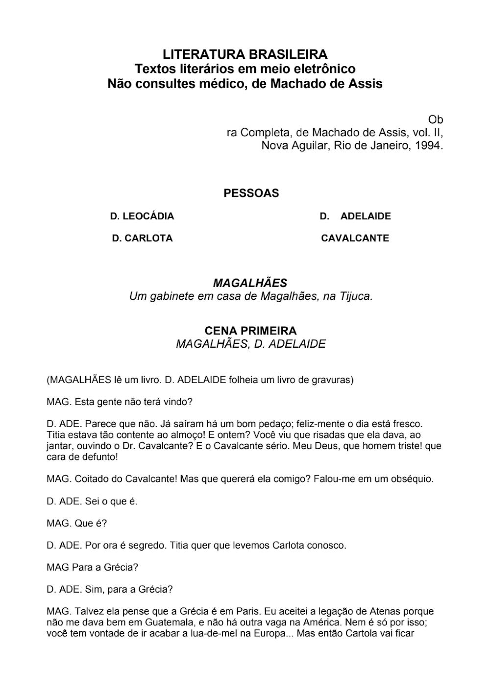 Adentre o universo da genialidade machadiana com este valioso excerto de Não Consultes Médico Machado de Assis, uma das notáveis peças teatrais do imortal autor brasileiro. Este documento digitalizado oferece um vislumbre detalhado da “CENA PRIMEIRA” da obra, apresentando a dinâmica dos personagens e o cenário que define o tom para a trama. Ideal para estudantes, pesquisadores e amantes da literatura, este texto é uma porta de entrada para a compreensão do Realismo e da crítica social que permeiam a obra de Machado de Assis.