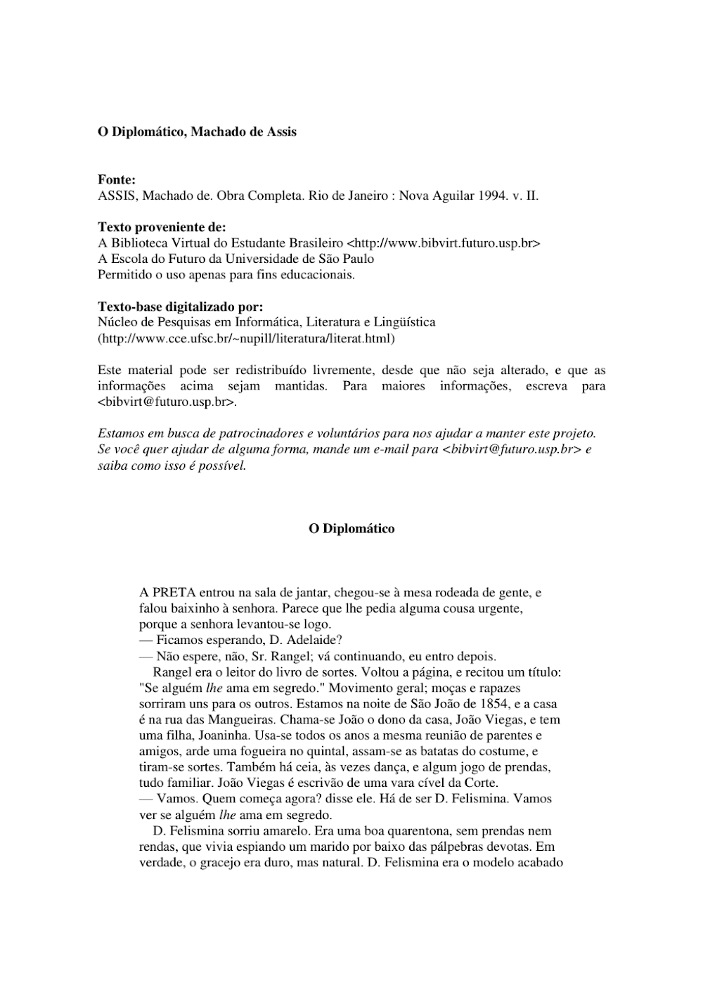 Este excerto de “O Diplomático” é um recurso valioso para quem deseja aprofundar-se na obra de Machado de Assis, no realismo brasileiro e na história social do século XIX. Ele permite uma análise direta da linguagem machadiana, da construção de personagens e da sua capacidade de tecer críticas sociais de forma sutil e inteligente. A alta qualidade da digitalização garante uma experiência de leitura clara e fidedigna ao texto original.