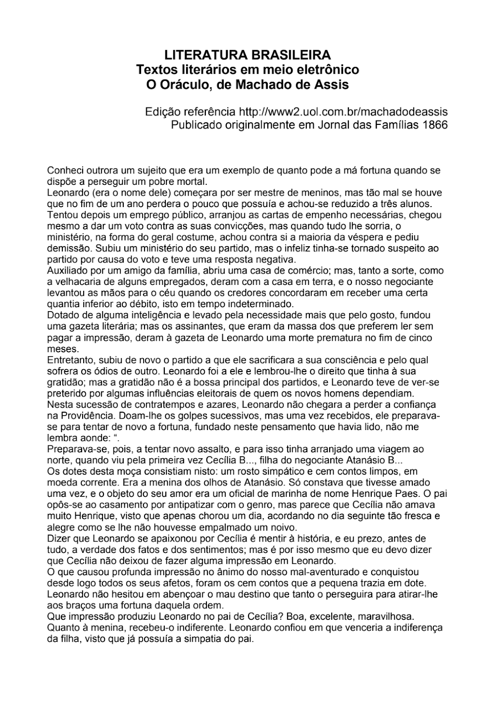 Não perca a chance de revisitar ou conhecer este clássico da literatura brasileira. O arquivo de O Oráculo de Machado de Assis está à sua disposição para download gratuito, proporcionando uma leitura enriquecedora e um mergulho na obra de um dos maiores escritores de nossa língua. Descubra as nuances da fortuna e do destino através dos olhos de Machado de Assis.
