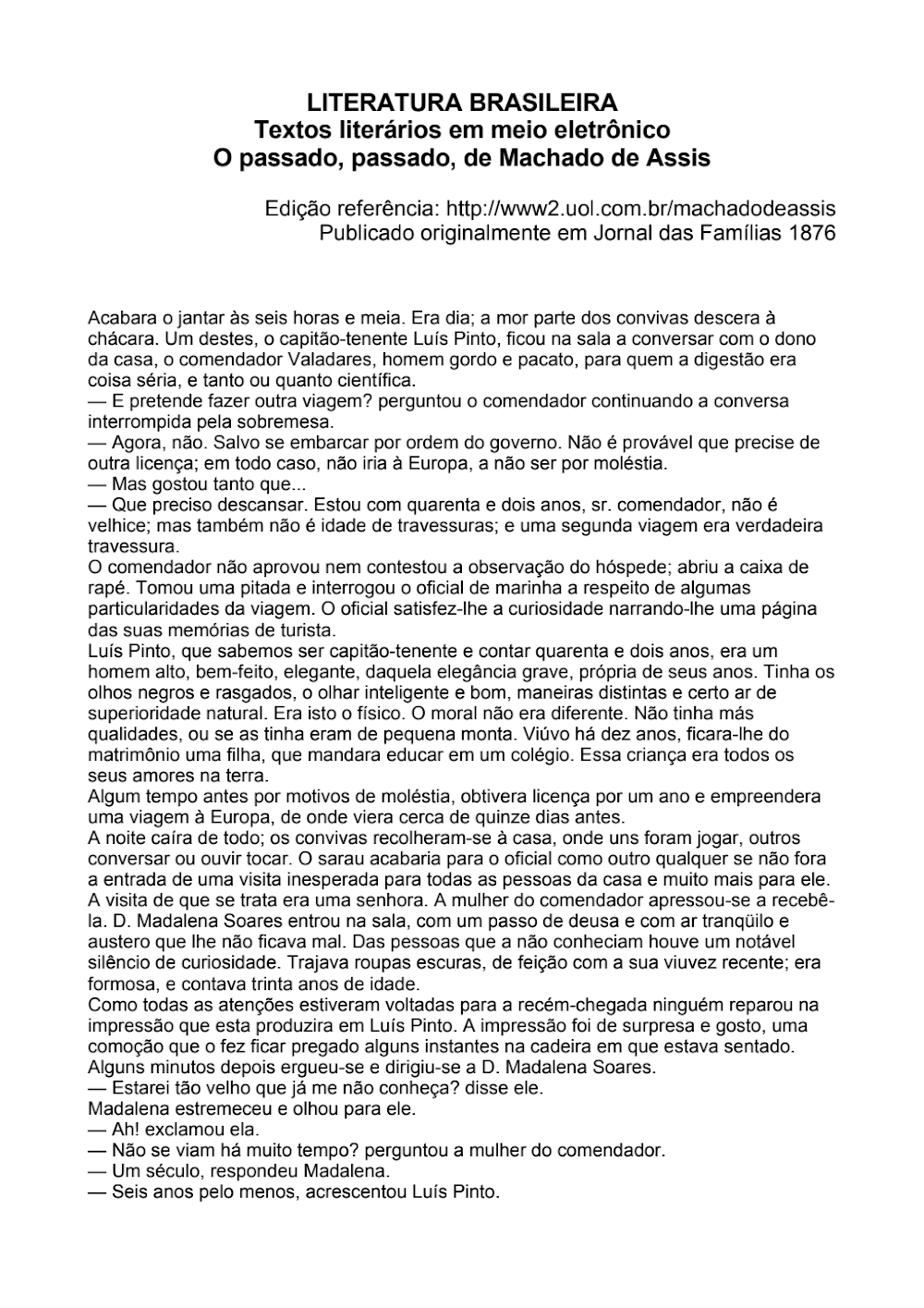 Após uma viagem pela Europa, motivada por moléstia e seguida de um período de descanso, Luís Pinto se vê em um sarau que prometia ser como qualquer outro. Contudo, a entrada de D. Madalena Soares transforma a noite. A surpresa e o gosto da impressão que ela produz nele são imediatamente perceptíveis, revelando uma história preexistente. O diálogo subsequente, onde Madalena afirma que “não se viam há um século” e Luís Pinto corrige para “seis anos pelo menos”, sela a natureza do seu reencontro: um passado que, embora distante, ainda ecoa fortemente no presente e nas emoções dos personagens.