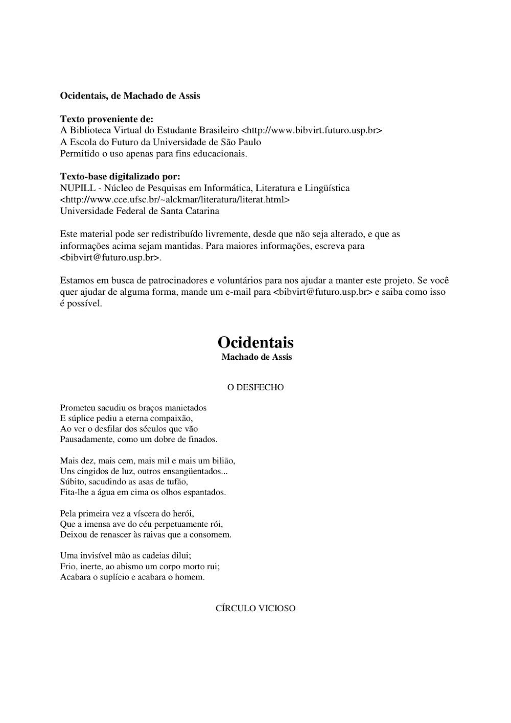 Além de “O Desfecho”, o documento introduz o icônico “Círculo Vicioso”, um dos sonetos mais aclamados da língua portuguesa. Este arquivo em particular é um testemunho da história da internet e da educação no Brasil, tendo sido digitalizado pelo NUPILL (Núcleo de Pesquisas em Informática, Literatura e Lingüística) da Universidade Federal de Santa Catarina e distribuído pela Escola do Futuro da USP através da Biblioteca Virtual do Estudante Brasileiro.