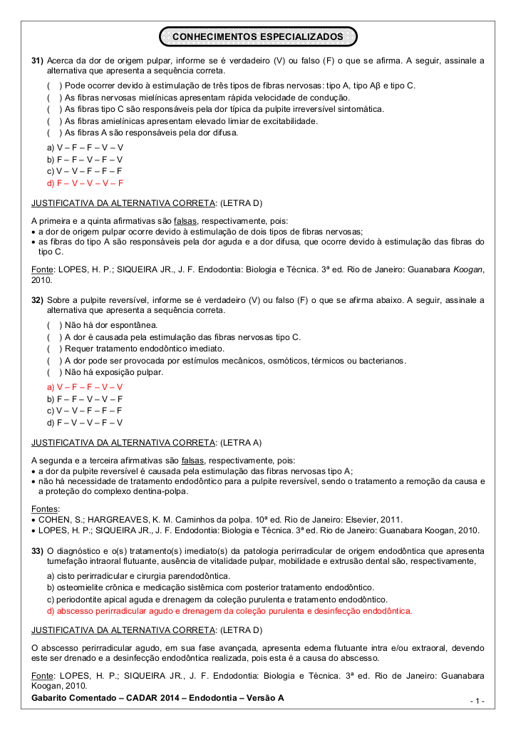 O documento disponibilizado aqui no Acervo On-line é o CADAR 2014 Endodontia, um material técnico fundamental que apresenta o gabarito comentado de uma das avaliações mais respeitadas na área odontológica. Este arquivo é uma fonte rica de consulta para estudantes e profissionais que buscam entender a aplicação prática de conceitos teóricos complexos, fundamentados por bibliografias clássicas da área.