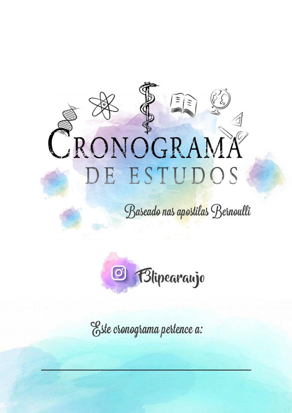Um dos grandes diferenciais deste cronograma é seu design cuidadosamente elaborado, que combina estética com funcionalidade. A capa, em particular, é um convite à organização, com sua paleta de cores em tons pastel de aquarela – azuis, verdes, rosas e roxos – que criam um fundo suave e acolhedor. Sobre este fundo, o título “CRONOGRAMA DE ESTUDOS” se destaca em fontes estilizadas, capturando a atenção do estudante.
