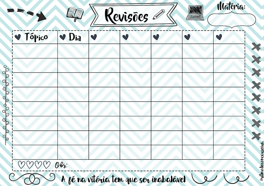 Criado originalmente pela marca digital @ritmodeconcurseira, este template reflete as necessidades reais de quem enfrenta rotinas intensas de preparação. Além da organização técnica, o documento traz a frase motivacional “A fé na vitória tem que ser inabalável”, reforçando o aspecto psicológico necessário para a constância nos estudos. O uso de um planner estruturado como este reduz a ansiedade e organiza o fluxo de informações, combatendo a curva do esquecimento de forma eficaz.