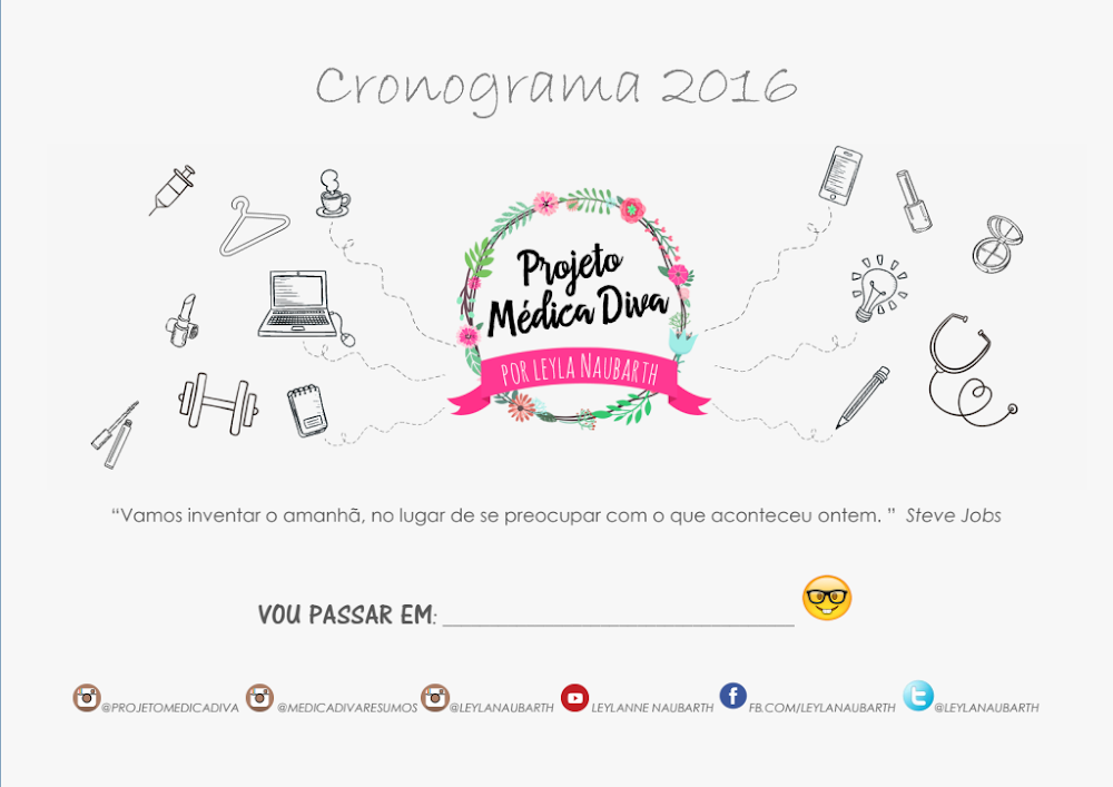 O “Projeto Médica Diva” surge como uma iniciativa de Leyla Naubarth, cujo objetivo é empoderar estudantes, especialmente do sexo feminino, a conciliar suas aspirações profissionais na medicina com um estilo de vida que valorize o autocuidado e o bem-estar. Lançado em 2016, este cronograma reflete as tendências da época, onde a organização pessoal e o planejamento estratégico ganhavam força, impulsionados pela ascensão das redes sociais e comunidades online dedicadas a estudos e desenvolvimento pessoal. A capa do documento já instiga essa mentalidade com a inspiradora citação de Steve Jobs: “Vamos inventar o amanhã, no lugar de se preocupar com o que aconteceu ontem”, um convite à proatividade e ao foco no futuro.