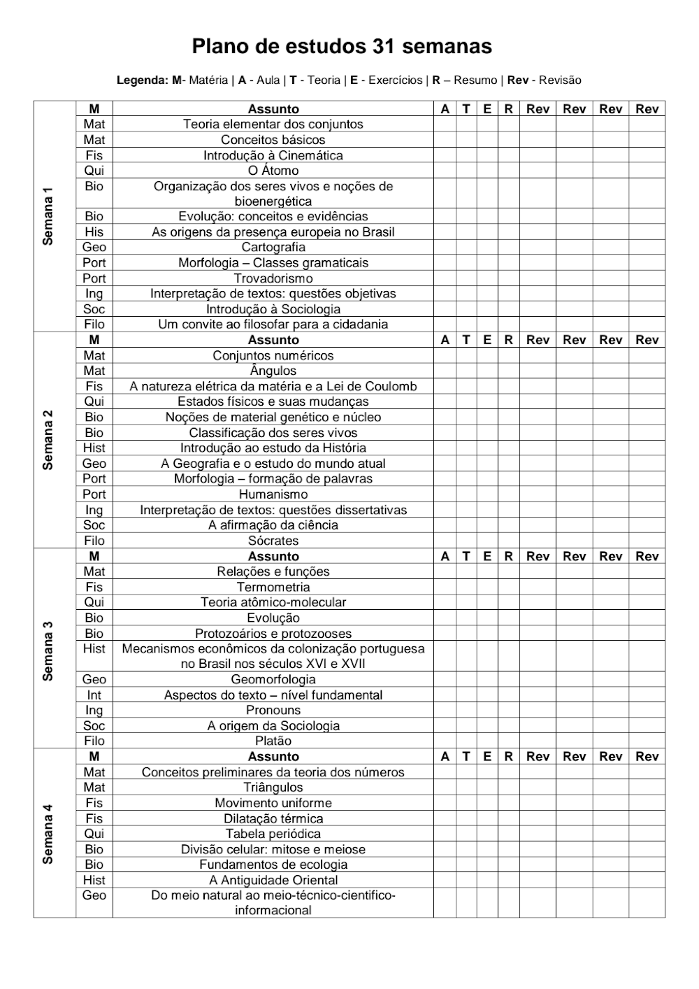 Este cronograma é um documento estratégico, estruturado em formato de tabela, que organiza o conteúdo programático em 31 semanas de estudo. Cada semana apresenta uma lista de matérias e tópicos específicos a serem abordados, desde os fundamentos até os conceitos mais avançados. As colunas são designadas para facilitar o acompanhamento do estudante, indicando se a Aula (A) foi assistida, a Teoria (T) estudada, os Exercícios (E) resolvidos, o Resumo (R) elaborado e se as Revisões (Rev) foram feitas. Essa metodologia interativa permite ao estudante monitorar seu progresso e identificar áreas que necessitam de maior atenção.