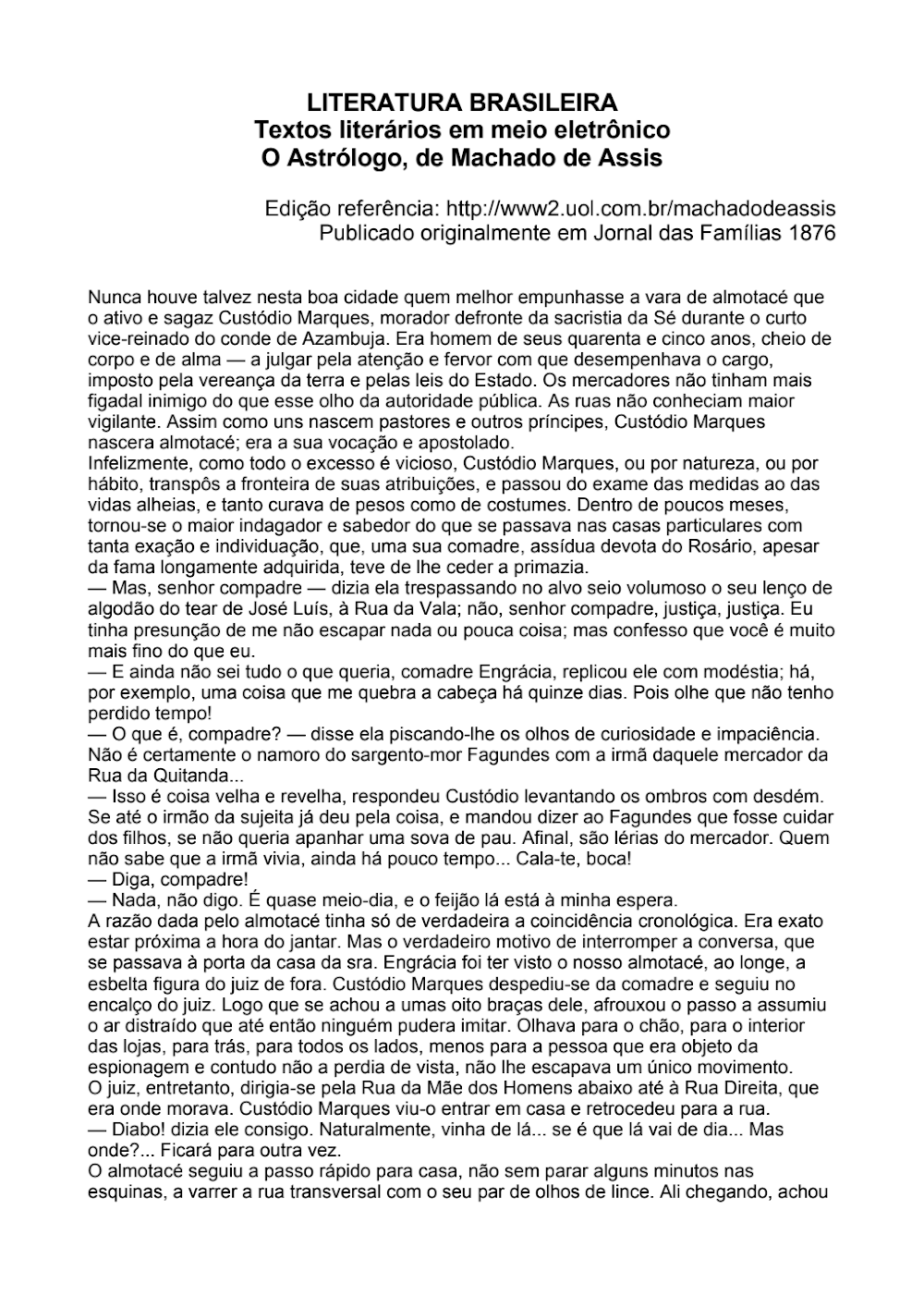 Este documento é uma peça essencial para pesquisadores da literatura brasileira e historiadores dos costumes. A menção ao Conde de Azambuja (1761-1763) serve como pano de fundo para situar a função do almotacé, enquanto a linguagem do século XIX reflete a sofisticação da prosa machadiana. A edição digitalizada mantém a fidelidade ortográfica e estrutural, permitindo uma imersão completa na obra.
