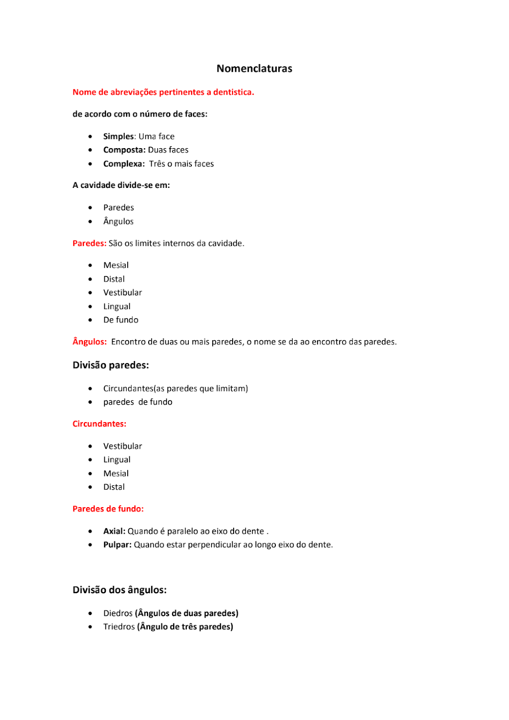Nomenclaturas Essenciais de Dentística (Odontologia)