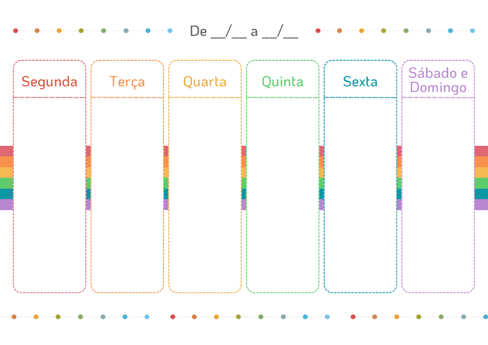 O grande diferencial deste arquivo é sua estética equilibrada. O uso de cores vibrantes como vermelho, laranja, amarelo, verde, azul e roxo nos títulos dos dias não é apenas decorativo; serve como um sistema de categorização cromática. Os detalhes pontilhados no topo e na base do documento reforçam o tema de leveza, criando um ambiente visual que estimula a produtividade sem sobrecarregar a mente.