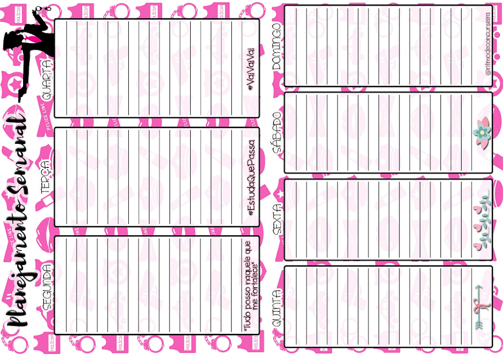 Este planejador foi desenhado para cobrir os sete dias da semana de forma estratégica. Com blocos amplos para anotações detalhadas, ele permite que a estudante distribua as disciplinas do edital — como Direito Constitucional, Penal e Administrativo — de segunda a domingo. A disposição visual facilita a visualização rápida da carga horária cumprida, essencial para quem mantém um ritmo intenso de preparação.