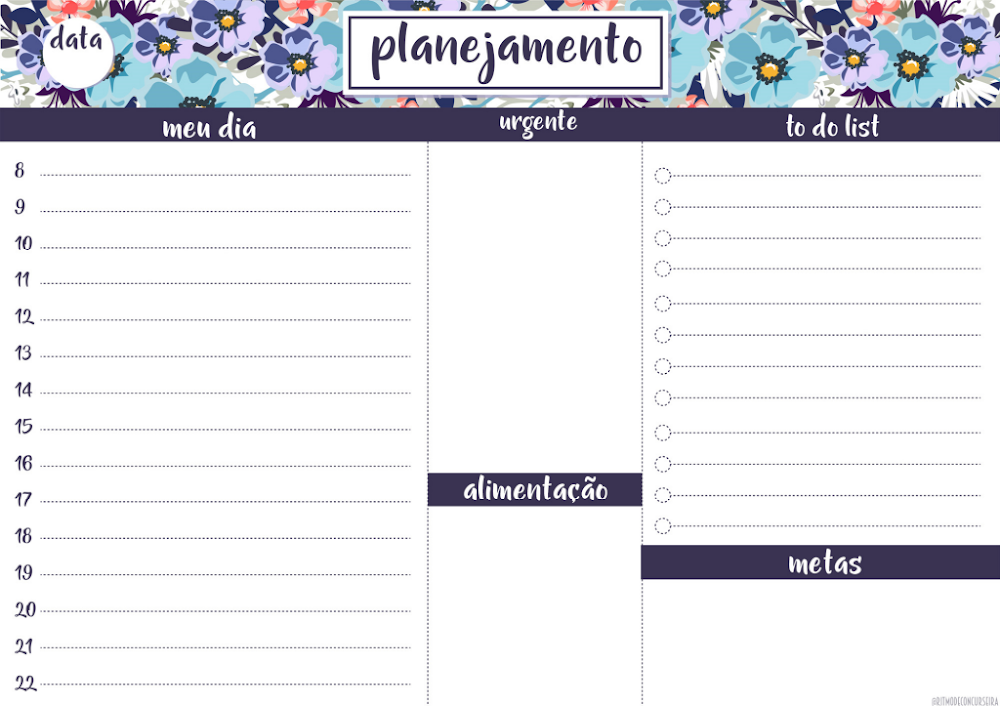 Este modelo de planejamento foi desenhado com foco na funcionalidade. Diferente de agendas comuns, ele segmenta o dia de forma estratégica, permitindo que o usuário visualize não apenas seus compromissos, mas também suas prioridades imediatas. A coluna ‘Meu Dia’ oferece um cronograma completo que abrange das 8h às 22h, cobrindo todo o período produtivo do estudante ou profissional.