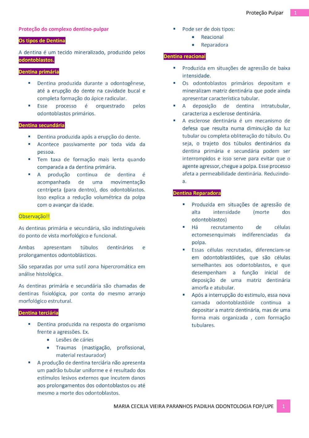 Estou procurando o documento que aborda os tipos de dentina e a proteção pulpar; onde posso obtê-lo?