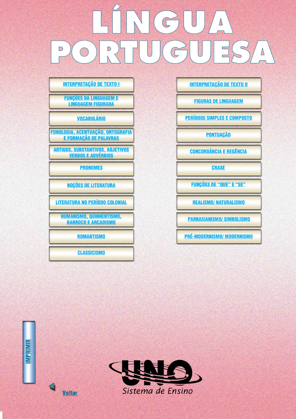 Desenvolvido pelo UNO Sistema de Ensino, este material reflete a qualidade e a didática de uma instituição renomada. A interface interativa não só organiza o conteúdo de forma lógica, mas também sugere um formato que pode ser explorado digitalmente, permitindo que os estudantes foquem nos tópicos que mais necessitam, como os que geram mais dúvidas em questões de Língua Portuguesa para o ENEM. A possibilidade de “IMPRIMIR” indica que o material também pode ser transformado em um guia físico de estudo, adaptando-se às diversas preferências de aprendizado.