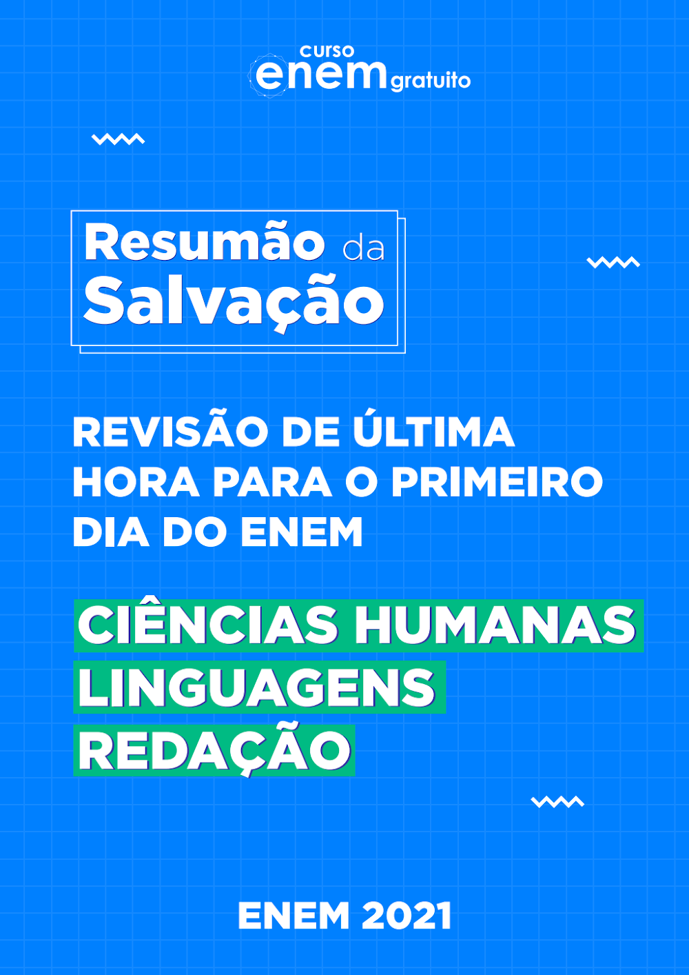 A estética visual do “Resumão da Salvação” é um ponto crucial de sua eficácia. Com uma paleta de cores predominantemente azul vibrante e verde-limão, o design é moderno, limpo e altamente legível. A utilização de fontes sans-serif bold e caixas de destaque para as disciplinas cria um senso de urgência e clareza, características essenciais para um material de revisão. Esse apelo visual não apenas atrai a atenção, mas também facilita a absorção rápida das informações, um aspecto vital em revisões de “última hora”. O padrão de grade sutil no fundo azul adiciona um toque de organização, sugerindo a metodologia e a precisão do conteúdo. Tal design reflete as estratégias de comunicação digital que buscam engajar o público jovem e estudantil.