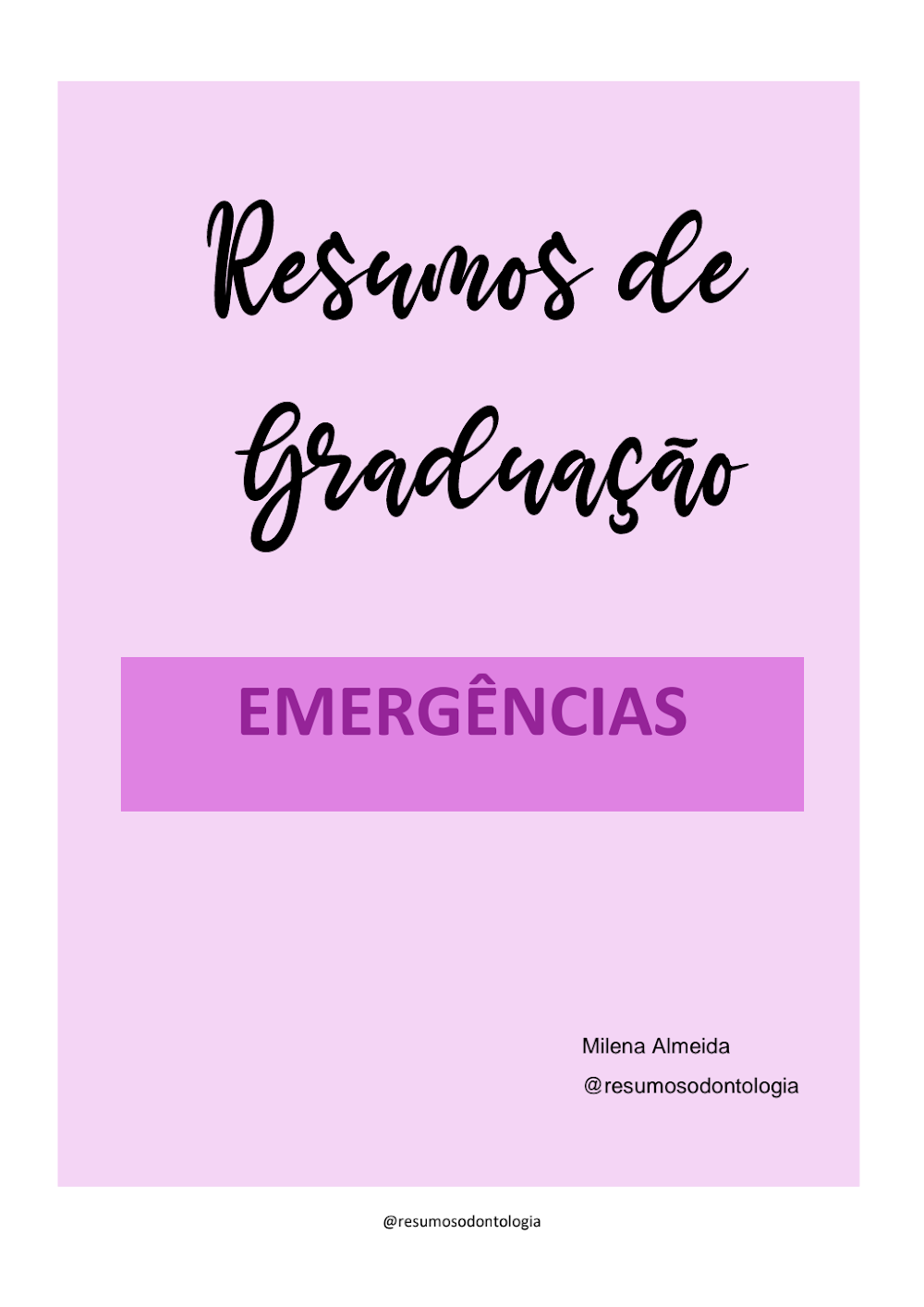 Apresentamos um recurso educacional de alto valor para estudantes e profissionais da área da saúde: o material “Resumos de Graduação: Emergências”, meticulosamente elaborado por Milena Almeida, criadora do projeto @resumosodontologia. Este documento é uma ferramenta indispensável para quem busca aprofundar seus conhecimentos em Resumos de Graduação Emergências Odontológicas, oferecendo uma compilação concisa e direta dos tópicos mais críticos. Prepare-se para otimizar seus estudos e ter à mão um guia prático para situações de urgência.