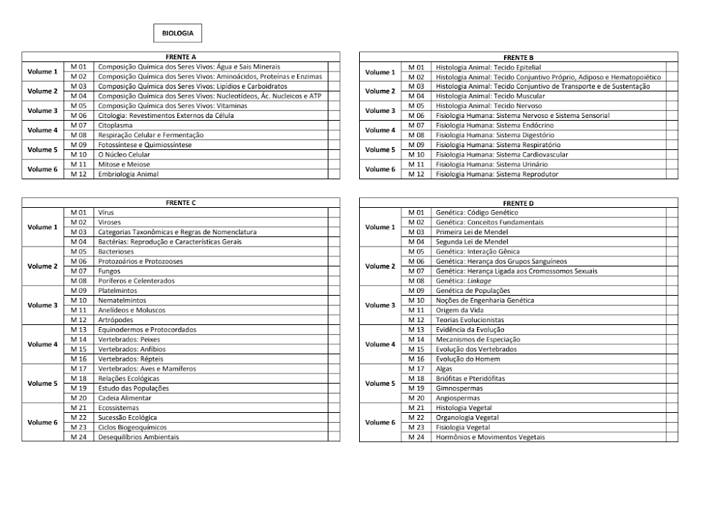O documento apresenta uma organização exemplar, dividindo a Biologia em quatro grandes frentes, cada uma com seus respectivos volumes e módulos. Essa metodologia permite um estudo segmentado e progressivo, facilitando a assimilação de conceitos complexos e a revisão de temas específicos. A clareza na apresentação dos tópicos em formato tabular é um diferencial, auxiliando o aluno a visualizar o escopo total do curso.