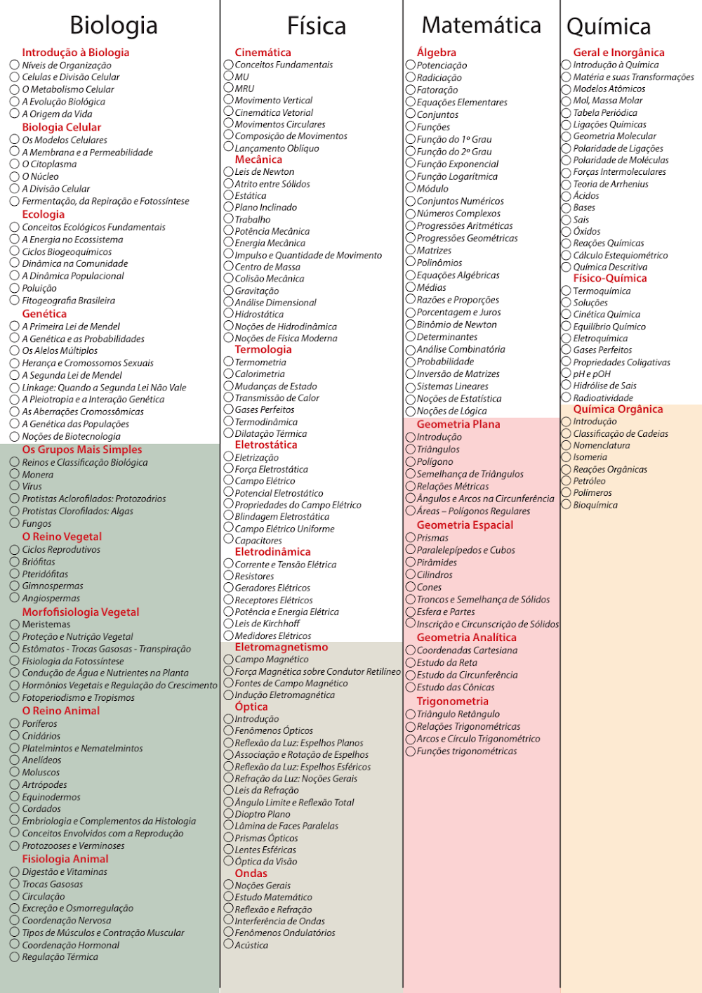 Este roteiro se destaca pela sua organização visual e pedagógica. Ele é apresentado em quatro colunas distintas, cada uma dedicada a uma das grandes áreas do conhecimento: Biologia, Física, Matemática e Química. Os títulos das colunas são evidentes, em negrito e com fonte destacada, orientando o leitor de imediato sobre o conteúdo de cada seção. Dentro de cada disciplina, os tópicos são subdivididos em seções menores, com cabeçalhos em negrito, o que permite uma navegação fluida e focada.