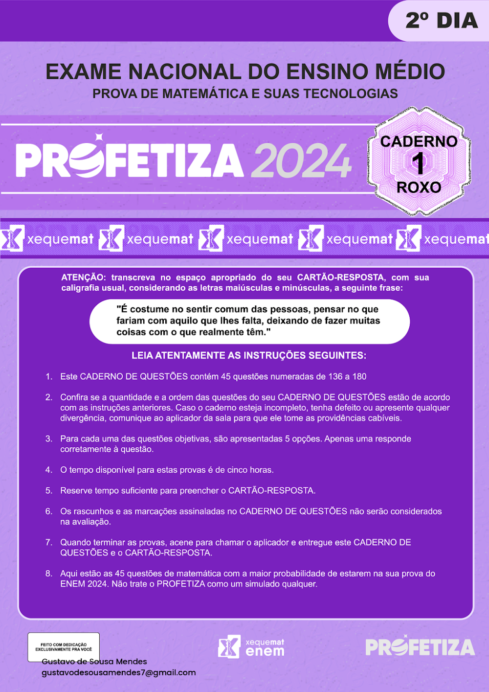 O documento disponibilizado aqui no Acervo Online é a capa detalhada do Caderno 1 Roxo do PROFETIZA 2024, que apresenta um conjunto de 45 questões, numeradas de 136 a 180, cuidadosamente selecionadas para maximizar sua preparação. Essas questões são as de maior probabilidade de estarem presentes em sua prova do ENEM 2024, tornando este material um diferencial para quem busca otimizar seu tempo de estudo e direcionar seus esforços para os tópicos mais relevantes.